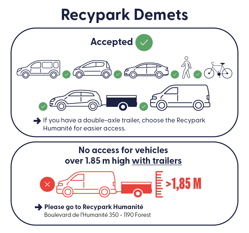 - Vehicles with a trailer and vehicles over 1.85 meters high must go to Recypark Humanité.