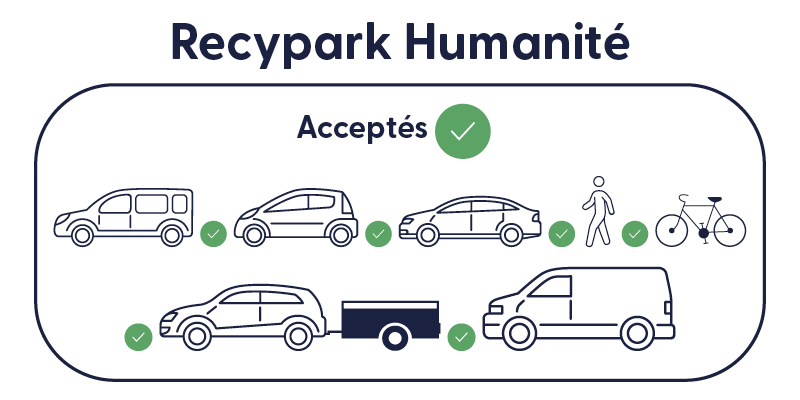 - Les véhicules avec remorque et les véhicules d’une hauteur de plus d’1,85 mètre doivent se rendre au Recypark Humanité.