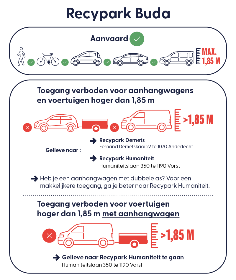 - Voertuigen met aanhangwagen en voertuigen hoger dan 1,85 m moeten naar Recypark Humaniteit gaan.