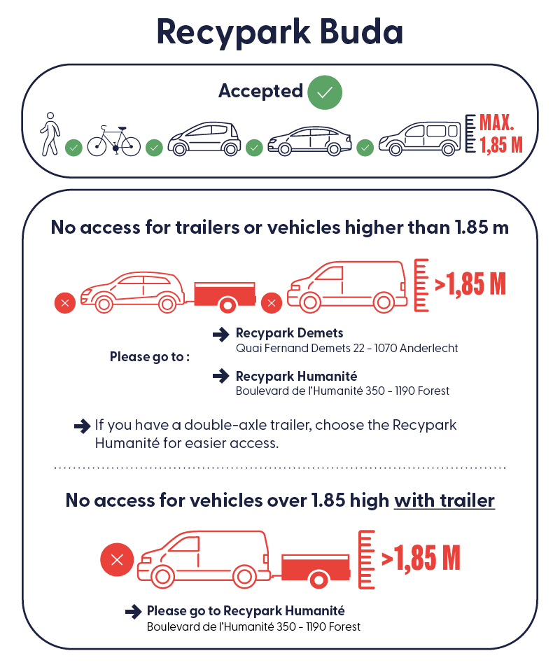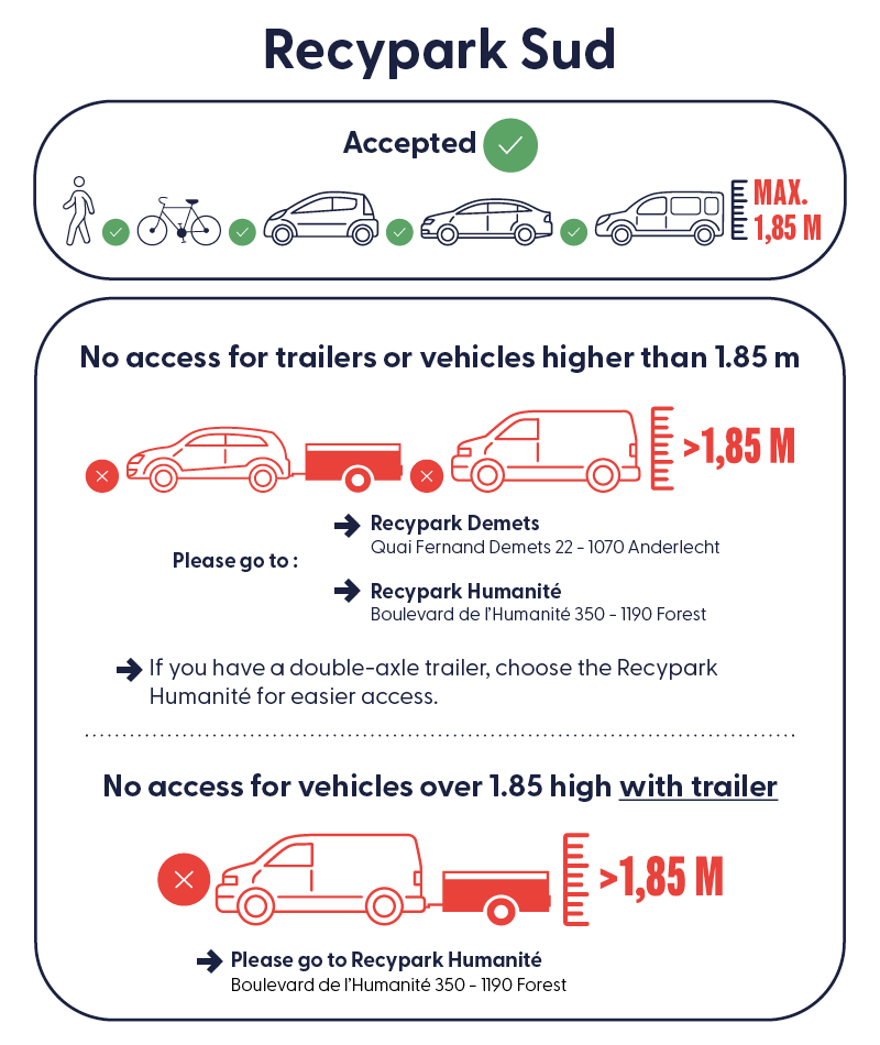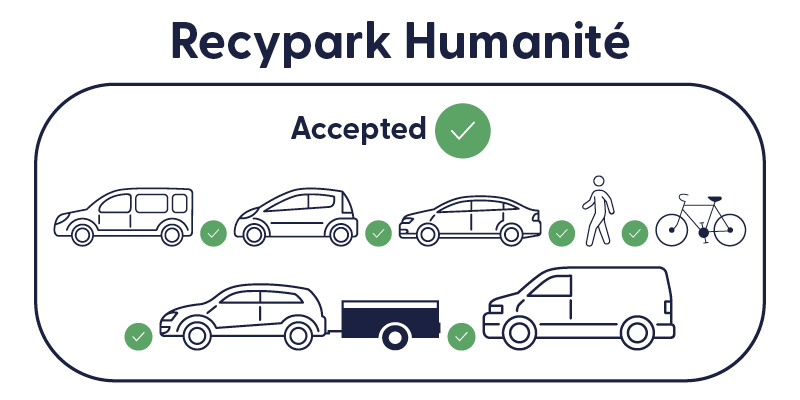 - Vehicles with a trailer and vehicles over 1.85 meters high must go to Recypark Humanité.
